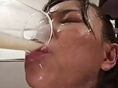 A group of men cums on Victoria's face in cum drinking bukkake orgy